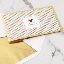 Pop-up birthday greeting card features a mouse ears icon in prismatic red foil paired with colorful stripes, a gold foil border and a “Happy Birthday” message on the front. Simply open the card to reveal the 3D pop-up surprise inside—no assembly required: an intricate, laser-cut layered birthday cake pops out with Mickey on top while Pluto keeps an eye on the presents. Die-cut balloons, festive patterns and foil accents add to the fun. This cheery card crafted from premium card stock is a work of art sure to be displayed all year long, making it an unforgettable way to share happy birthday wishes with a special kid or Disney fan. When open, this pop-up card lays flat for display; 3D pop-up inside measures approx. 5″ tall.