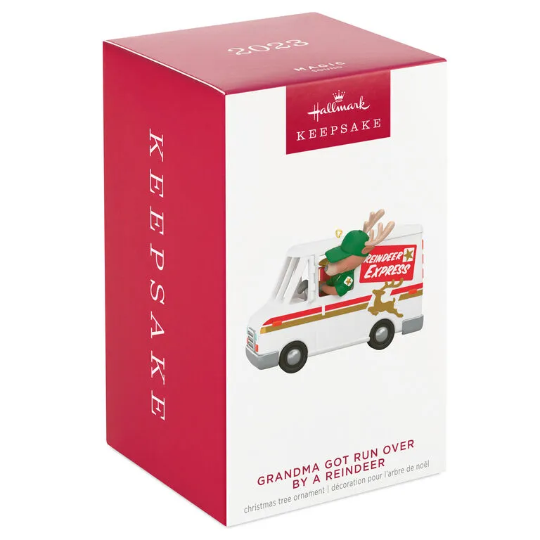 Speed into holiday fun with this hilarious Christmas tree ornament that features a mischievous reindeer behind the wheel of a delivery truck. The musical decoration plays part of the classic song “Grandma Got Run Over by a Reindeer” (battery-operated).