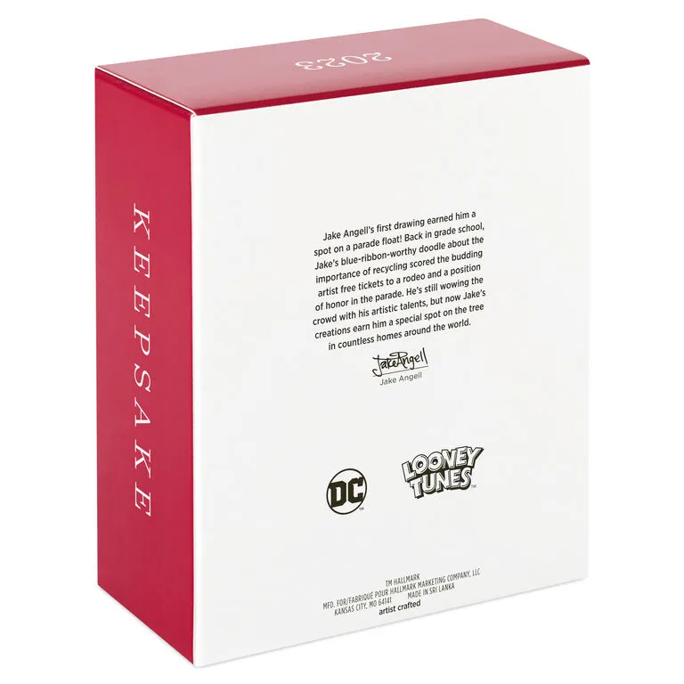 Celebrate 100 years of storytelling from the Warner Bros. studios with these fun Christmas tree ornaments. While Batman may have his Robin, that doesn’t mean Wile E. Coyote will end up with his Road Runner—but that never seems to stop the coyote from scheming! Hang this set of two Looney Tunes decorations featuring the conniving canine disguised as the Caped Crusader and an iconic ACME Products shipping box to bring a Super Hero-sized smile to any holiday decor.