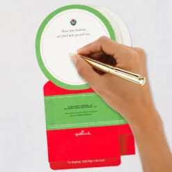 Musical pop-up Christmas greeting card with motion features a laser-cut, three-dimensional snowy scene of an antique red truck and a charming mountain village inside of a 3D snow globe-style design. Musical card plays the song “We Wish You a Merry Christmas” while “snow” blows inside when button on front is pressed. Simply unfold the card to create a fun surprise—no assembly required—that can be displayed all season long. When open for display, 3D pop-up card measures approx. 7″ H.