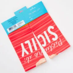 Picture it: A stylish taste-maker becomes the envy of Sicily, Miami and everywhere they go when they wear these adult-size crew socks featuring an illustration of Sophia Petrillo from “The Golden Girls.” A funny quote and stripe design on a pinkish-red background with gold cuff and toe complete the fabulous footwear.